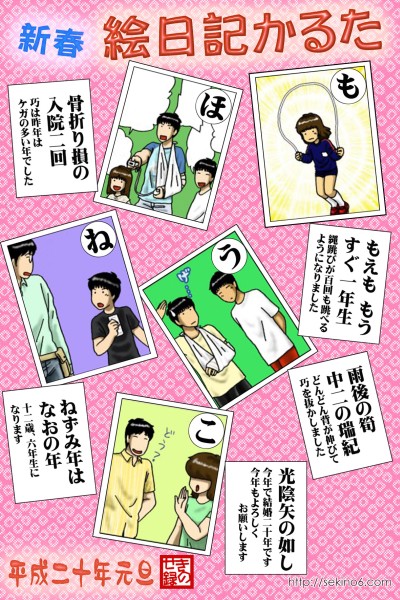 今回はなかなかネタが決まらず、ギリギリまで絵を描けずにいました。 結局、うっすらと考えていた、絵日記の絵の使いまわしという最終手段に。 絵日記を見てくれている人にとっては、手抜きな年賀状ですみません。 まあ、ネタ的には、お正月らしいっちゃらしいんだけど、新年の挨拶を 書くのをすっかり忘れました。重ね重ね、ホントすみません。 ◆◆◆ 今年もなおの年賀状は、なおのオリジナルイラストで。 今年はペイントに逆戻り。でもアイデアがいいよね。